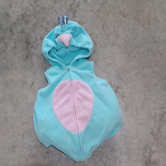 Adorable peacock costume by Carter's. Features a blue body with a pink belly. Hood includes a cute peacock face and crest.