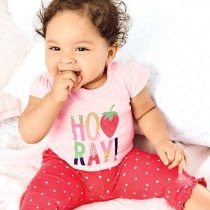 Carter's offers cute and comfortable clothing with soft, durable fabrics! Cap sleeve bodysuit features glittery Hooray! text, a strawberry graphic, small bow accent, shoulder snaps, and front facing snaps for easy changes. Set includes a coordinating pair of pull-on pants with polka dot print, fun ruffle cuffs, and an elastic waist.