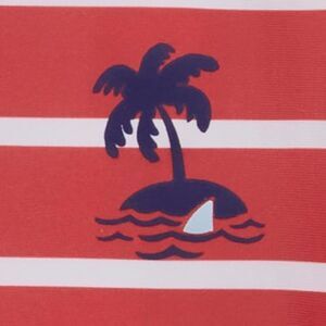 2-pack rashguard set includes one blue scenic sailboat print and one red and white horizontal stripe print with scenic print on left chest.