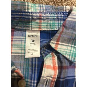 This lot includes three boys' button-up shirts from Carters, sized 3T. The set features two short sleeve and one long sleeve shirt, all in a multicolor plaid pattern with Orange accents. Made from woven cotton, these shirts are comfortable and stylish, perfect for casual fall occasions. They offer a regular fit and are machine washable for easy care. The shirts are pre-owned.