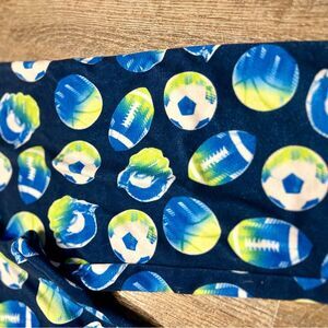 Comfy and fun! These Carter’s boys’ pajama pants (size 8/8A) feature a cool sports ball print — footballs, basketballs, and soccer balls in shades of blue, green, and white.
