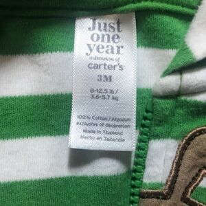 Carters green and white striped zip up jacket. It has a bull dog on the front with a hoodie with ears on the top. Size 3 months.
