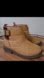 Brown ankle boots with decorative side buckle and metallic panels on heel backs. Pull tab. Side zipper closure. Soft interior lining.