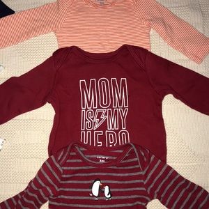 3 short sleeve carters onesies and 3 long sleeve carters onesies 1 pants to match onesie. 3 months , barely worn washed in baby detergent , smoke free home.