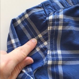 Classic blue and white button down from Carter’s. There is a small spot on the sleeve, I pointed it out in the 3rd picture. In great condition other than small spot. Smoke free, pet friendly home.