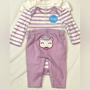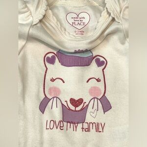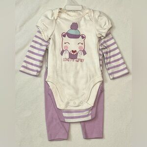 White short-sleeve “love my family” bodysuit, long-sleeve purple striped bodysuit, and purple pants.