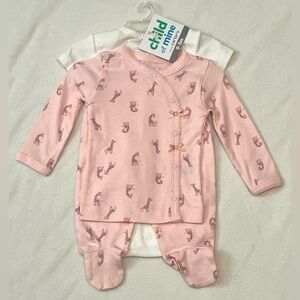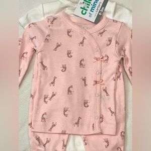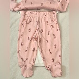 Pink giraffe long-sleeve button up with pink pants and giraffe onesie to match.