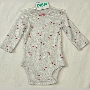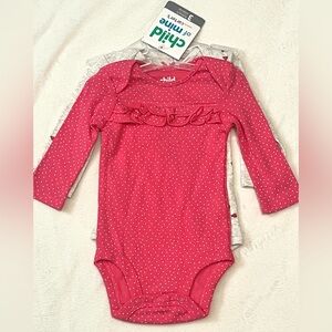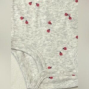 2 Long-sleeve body suits in dark pink with polka dots & gray with ladybugs.