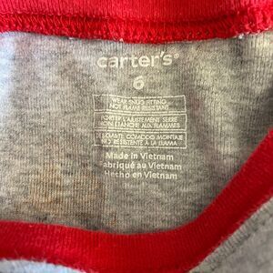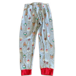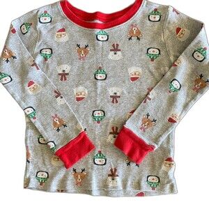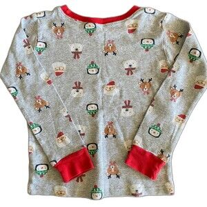 Carter's pajama set, unisex child's 6, 100% cotton. Long sleeves & pants, red banded cuffs, elastic waistband, gray background with face prints including Santa/penguins/reindeer/polar bears in traditional Christmas colors. Some fading and shrinkage, loose seams on back of shirt hem.