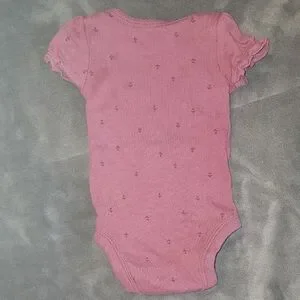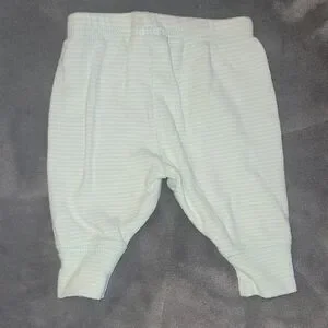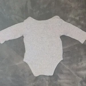 Navy striped romper with buttons. Soft gray bodysuit. Light green pants with footies. Purple onesie and cute grey top. Comfortable and stylish.