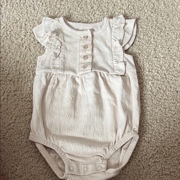 Adorable cream one piece with ruffled sleeves. Features button details and snap closures for easy dressing.