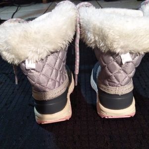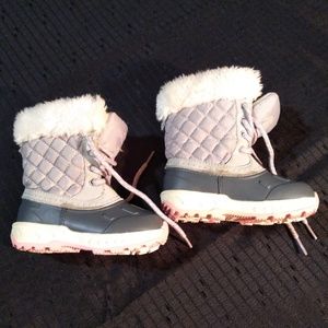 These are really warm girl's duck boots with pink soles. They are fur lined and waterproof at least as far as the ankle. The sides are quilted silver material that may also be waterproof although, I don't know that for sure. They are a girls size 7. They are in excellent condition. There is no visible wear on the soles. They have a pink sole w/ white ring above that. Then the foot of the shoe is charcoal grey. The sides are silver, the fur is white. Like New Condition!