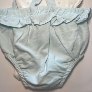 Cute two piece Easter set! Has a small bunny pocket on front. Ruffles. Straps have buttons on the inside of the romper. Both 100% cotton. Both has button closure at bottom for easy diaper change