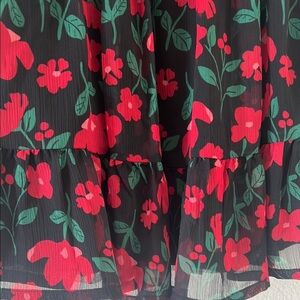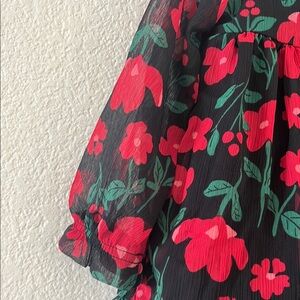 Charming dress with sheer sleeves and vibrant floral pattern. Perfect for any occasion.