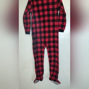 Previously Owned, this is a JUST ONE YOU made by Carter's Footed/Footie Pajamas for Kids, SIZE 5. Black & Red Buffalo/Lumberjack plaid. Soft Material. Has the plastic grips on bottom of feet for no slipping. The bottoms are a gray/tan in color. There is a White Polar Bear embroidered patch on front. Zips up front, buttons near neck.