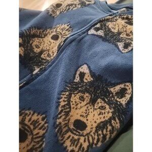 The product is a cute and cozy pair of Carter's full zip up footed fleece pajamas in a blue color with a wolf graphic all over. These pajamas are perfect for boys in size 7, featuring long sleeves, a zip closure for easy dressing, and made from soft fleece fabric. The wolf pattern adds a fun and playful touch, making it ideal for winter, fall, and spring seasons. Machine washable and in excellent condition, this one-piece pajama set is a great addition to any young boy's sleepwear collection. See pictures for condition and any signs of use.