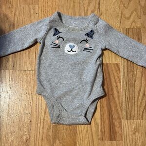 Adorable gray bodysuit with cat face design. Long sleeves. Snap closure for easy dressing. Stain on onesie, see photo.
