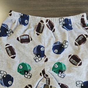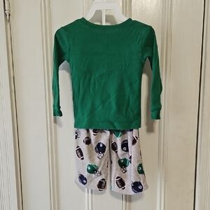 Green top with football graphic. Gray shorts with football print. Perfect for bedtime fun.