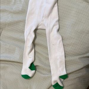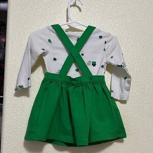 Adorable green dress with suspenders. Features shamrock prints on a white top. Perfect for festive occasions.
