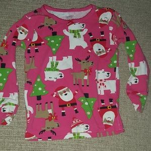Carter's. Size 2T. Pink with santas, trees, reindeer and dogs. 2 piece pajama set. Long pants and long sleeved top. This item is new without tags. No rips, tears or stains.