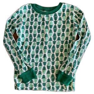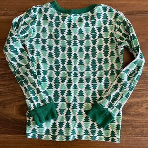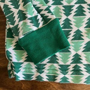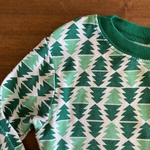 Carter's pajama set, unisex child's 5, 100% cotton. Long sleeves & pants, green banded cuffs, elastic waistband, evergreen tree print in two shades of green. Some slight shrinkage and fading, most noticeable on knees.