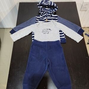Carter's Fleece Hooded Little Rhino 3 Piece Set- Size 9 Months. This set includes fleece zip up hoodie, fleece pants and long sleeve onesie that snaps under.