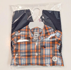 Boys 9M 2pc set with navy blue elastic waist pants and orange, navy blue and white plaid shirt with button sleeves. 100% Cotton. New w/Tags.