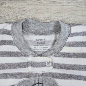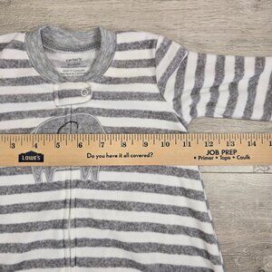 Set of two infant sleepwear sack suits 0-3 months and 3-6 months. The Carter Infant Baby PJ's Sack Suit Bundle in Gray Stripe Elephant design is a cozy and comfortable one-piece outfit suitable for casual occasions. Made from a velour fabric blend with embroidered accents, this sack suit features a zip closure, crew neck, and long sleeves, making it perfect for keeping your baby warm during the winter, fall, and spring seasons. The unisex design and adorable elephant theme add a fun touch to this easy-care and breathable garment, ideal for your little one's sleep time.Thank you for visiting this listing.
