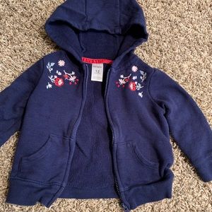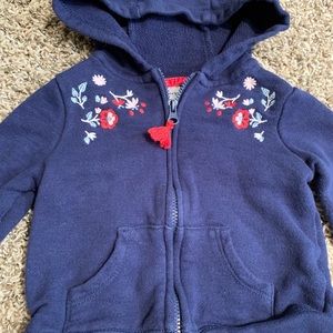 Navy blue with embroidered flowers and little red tassel on zipper & in excellent used condition! 💕