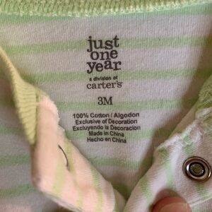 Carter’s Just One Year light weight sleeper. There is minor stains on the front by the collar. Please ask any and all questions prior to purchase. Thanks for looking!