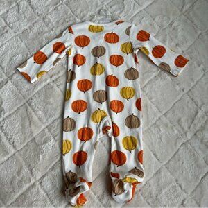 Details: Built-in pumpkin footies, no grippers. Allover pumpkin print. Two-way zip front. Safety tab to protect little chins. Unisex, super cute for boys or girls.