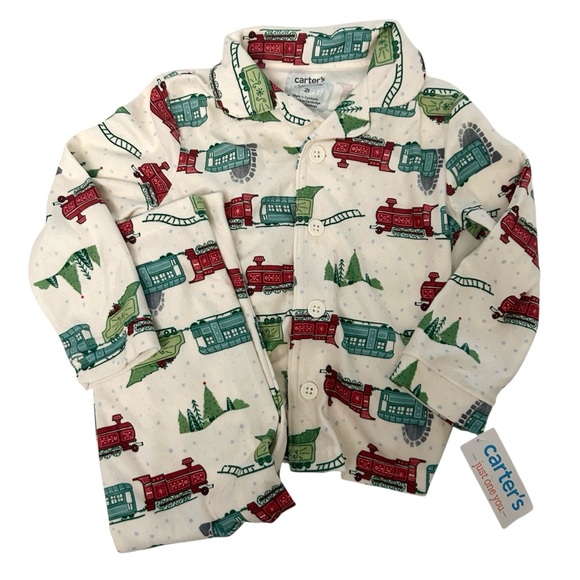 🆕 Carter’s Just One You Soft Fleece Pajama Set Christmas Trains Trees Cosy Sz 2T