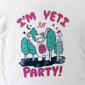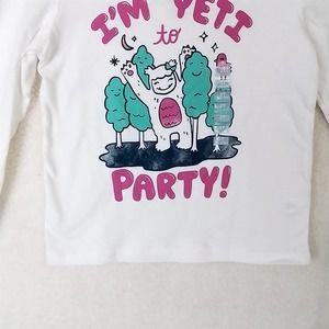 This 100% cotton tee is lightweight and breathable. It features a crew neck, long sleeves, and relaxed fit. The white shirt has a night-themed Yeti graphic that says "I'm Yeti to Party." This T-shirt is new with tag.