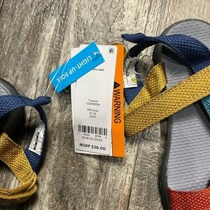 Colorful sandals with red, blue, and yellow straps. Perfect for active play.