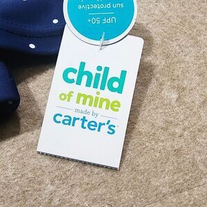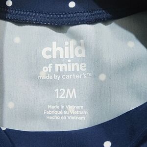 This adorable brand new 12M Carter's rash guard swim set features a navy top with playful polka dots and a cute crab design. Paired with classic white and navy striped bottoms, this set is perfect for fun in the sun.