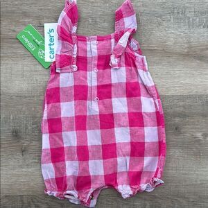 Charming pink plaid baby romper by Carter's. Features ruffled straps and button details.