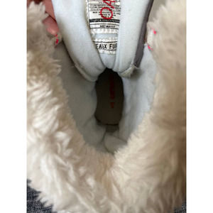Pre-Owned. Faux fur is no longer bright white. Uppers and bottoms still in good condition. Mark on right upper on right boot.