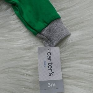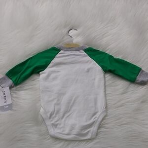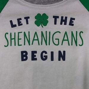 NWT St. Patrick's Day bodysuit with "Let The Shenanigans Begin" across the front with A Shamrock smiley face. There's a tiny area on the upper right on back with a black mark, see lat pic. This was a 2 piece with pants but pants aren't included.