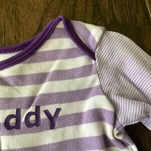 Lilac and purple stripes DADDY onesie in good preowned condition. Notable piling from washing. No other flaws.