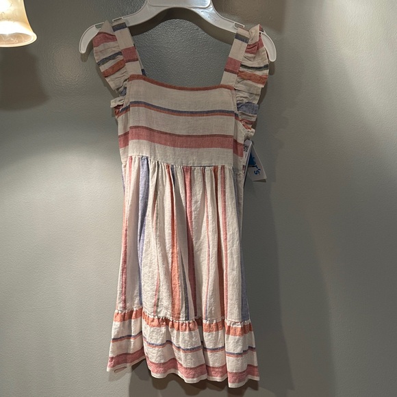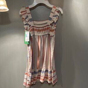 Adorable dress with multicolor stripes and ruffle details. Ideal for casual outings.