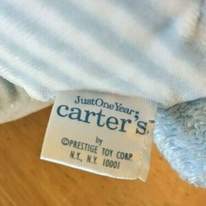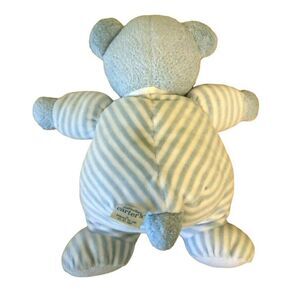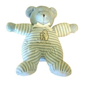 8 inch long Carter's Just One Year chubby blue teddy bear plush wearing blue and white striped pajamas embroidered with two white bears and the words "My First Smile". It has a large fluffy stomach with a rattle inside. This soft toy is in very good used condition with some light wear on the fur. NOTE: the bear is blue and white, not yellowed, that's out lighting for these photos, sorry.
