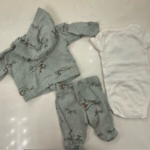 Lightweight matching set from Carter's. Includes a green zipper hoodie, pants, and a white onesie. Features playful airplane design.