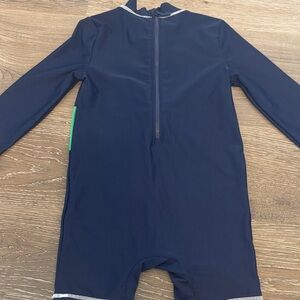 Navy swimsuit with a playful green alligator print. Features a fun snorkel design.