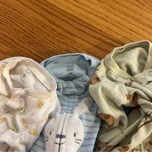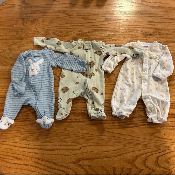 This charming bundle of PJs features delightful designs in blue, green, and white. Perfect for keeping your little one cozy and stylish. The blue bunny onesie has a small stain on one of the wrists as shown in the photos.