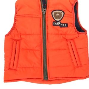 Carter's orange puffer vest with patch bear emblem. Olive green zipper and navy lining. Like new condition worn once.