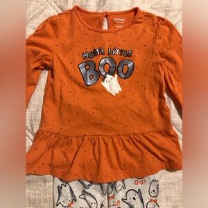 Adorable Carter's Halloween set. Orange top with 'Mom's Little Boo' print. Gray leggings with ghost pattern. Perfect for festive fun.