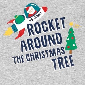 2nd set is Gray and nave blue with rocket design and says Rocket Around the Christmas Tree
