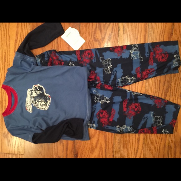 Carter’s PJs designed with fire engine print. The set has long sleeves, long pants with elastic waist and the soft material is flame resistant. Size 6 #petfree #smokefree