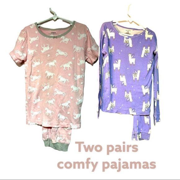 Short sleeve pink gray and white unicorn pajamas size 12 gently worn and washed. Size 12 llama pajamas and purple and white with long sleeves also size 12 has been worn and washed. Both pajama sets are stretchy lightweight and super cute and comfortable and both have long legging pants with the set.