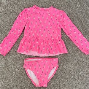 Charming pink rashguard set with cute flamingo design. Ideal for pool or beach fun.